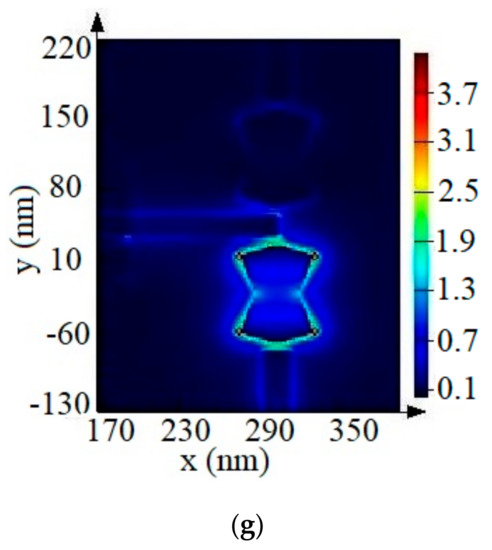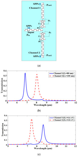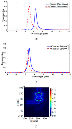 By modifying the cross-shaped resonator described in previous section, we propose and analyze a two-channel plasmonic demultiplexer in this section. The 2D view of two-channel plasmonic demultiplexer is depicted in Figure 4a. Transmission spectra of the two output channels of the demultiplexer are presented in Figure 4b–e. The differences of the resonators of Figure 4b–e are respectively the lengths, Fermi energies, widths, and angles. Other parameters are the same as reported in Table 1. Electric field profiles of the proposed demultiplexer for the resonators with different lengths in the resonance wavelengths of λ=6.8 µm and λ=8.05 µm are respectively presented in Figure 4f,g.