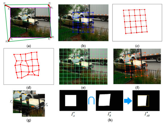 Step 3: According to Equations (1) and (2), transform the M × N grid points GA into new corresponding M × N points by using the homography matrix , as illustrated in Figure 1c.