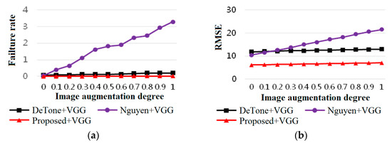 Robustness of DeTone’s algorithm, Nguyen’s algorithm and the proposed algorithm using VGG: (a) Failure rate; (b) RMSE.