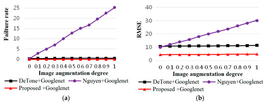 Robustness of DeTone’s algorithm, Nguyen’s algorithm and the proposed algorithm using Googlenet: (a) Failure rate; (b) RMSE.