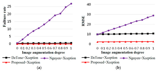 Robustness of DeTone’s algorithm, Nguyen’s algorithm and the proposed algorithm using Xception: (a) Failure rate; (b) RMSE.