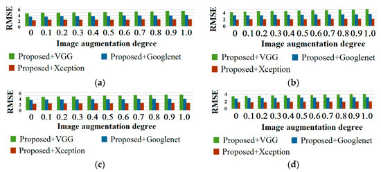 Figure 2, Figure 3, Figure 4 and Figure 5 show the failure rate and RMSE achieved by different algorithms under different image augmentation degrees. The abscissa is the image augmentation degree of the test set, which changes from 0.0 to 1.0 with a step size of 0.1; the ordinate represents the registration failure rate or RMSE. Figure 2 shows the robustness comparison of seven image registration algorithms, in which the CNN model used by DeTone’s and Nguyen’s algorithms is VGG, while the model used by the proposed algorithm is Xception. As can be seen from Figure 2, the robustness of the traditional image registration algorithms to illumination, color, and brightness is very poor, and the robustness of the learning-based algorithms, especially the supervised learning-based algorithm, is better than that of the traditional ones. Figure 3, Figure 4 and Figure 5 further give robustness analysis of the three learning-based image registration algorithms under three different CNN models. The used three CNN models are VGG, Googlenet and Xception, respectively. It can be seen that under the same neural network model, the robustness of Nguyen’s algorithm is inferior to the other two algorithms. Nguyen’s algorithm uses L1 norm as a loss function in the unsupervised learning algorithm, requiring the same image augmentation parameters for and in each pair of samples during the training, otherwise, the model will not converge normally, which results in the poor robustness of the unsupervised learning image registration algorithm. In contrast, DeTone’s algorithm and the proposed algorithm do not have this problem, because both of them adopt supervised learning; the label value can supervise the training of the neural network very well, so the model has better robustness.