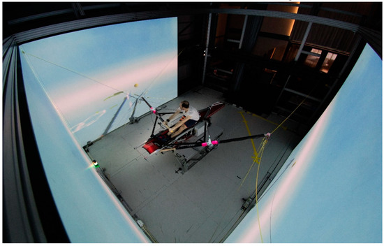 In the study, our custom-made rowing simulator was used (Figure 1) [21]. The rowing simulator consisted of an instrumented, shortened, single scull boat (Stämpfli Racing Boats AG, Zürich, Switzerland). The boat was placed on a platform in the middle of three 4.4 m × 3.3 m sized screens, i.e., one screen in front of the stern and one screen to each the left and right side of the boat [30].
