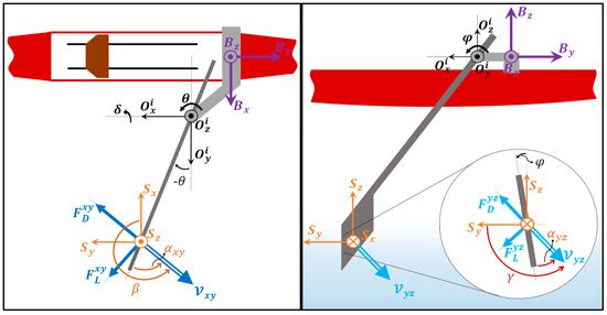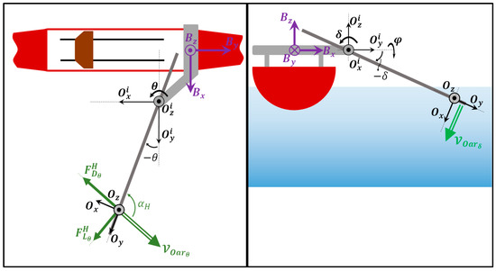 According to the model presented in [34], the angle of attack used for the horizontal plane (xy) was defined between the velocity of the oar blade () and the longitudinal (transverse) axis of the oar blade, yielding . Following a similar approach, the angle of attack used for the vertical plane (yz) was defined between the component of the oar blade velocity and the cross section (vertical axis) of the blade, resulting in .