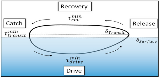 where and are the vertical oar angles at which the tip of the blade touches the water surface and the blade is fully immersed in the water, respectively. Placement of Equation (16) in Equations (14) and (15) allowed for a smooth transition of forces between the drive and recovery.