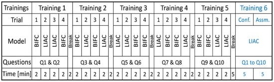 Experimental protocol. Training 1 to 5 were run in the first part of the experiment. Training 6 was run in the second part. Conf. and Assm. stand for Configuration and Assessment, respectively.