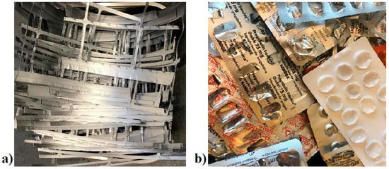 Waste pharmaceutical blisters (WPBs) are a type of multimaterial waste. They are the most commonly used type of packaging to store pharmaceutical products [,]. They contain approx. 80% thermoformable plastic films (usually polypropylene (PP) and pure polyvinyl chloride (PVC), or polyvinyl with diaphone addition (PVC/PVDC) or chlorotrifluoroethylene PVC/CTFE)) and 20% aluminum alloy (containing approx. 85% Al, 11,5% Mg, and 0,8% Ti) [,]. The type of plastic used to produce the blister is usually chosen based on moisture permeability, which has a huge influence on the durability of the products and the price. In order to provide the highest protection from external conditions, the companies sometimes use the Al/Al type blisters, which contain polyamide, aluminum, and PVC. Two layers of aluminum protect the products from moisture, which may decompose the active ingredients and affect the expiration date of the medicine, oxygen, and sunlight [].
