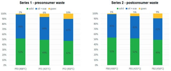 The solid and liquid products were weighed after the process, after the reactor was cooled to room temperature. The mass of the generated gases was calculated based on the measurements. The mass diagrams for the products obtained from series 1 and 2 are presented in Figure 3.