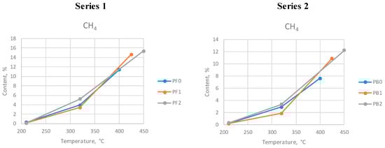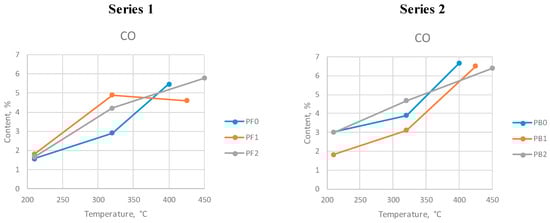 The diagrams showing the changes in the contents of the selected gas compounds are presented in Figure 4, Figure 5 and Figure 6. Tests PF0 and PB0 were performed at a maximum temperature of 400 °C. Tests PF1 and PB1 were performed at the max. temperature 425 °C, and tests PF2 and PB2 were performed at the max. temperature 450 °C.