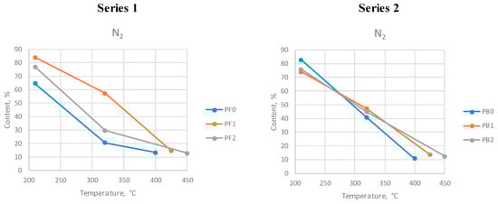 The nitrogen content decreased with temperature during both series. The minimum level (approx. 10%) has been reached by the end of each process. The level of nitrogen was high at the beginning of the process, which was caused by the presence of this gas in the atmospheric air. As the process proceeded and the gases were generated, nitrogen was removed from the reactor.
