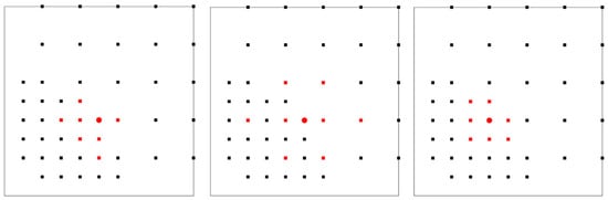Nodes contained in the support domain (red squares) of three representative nodes, located at the boundary of the refinement (red circles).