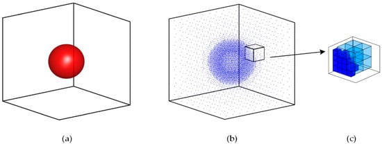Apart from the form of the weight function, the shape of the integration domain is also critical to the success of the method. Notable increase of the stability and robustness of the method has been reported using rectangular type domains in 2D problems [18]. Usually, equidistant domains around each node are used in MLPG implementations, with a radius around 60% of the local grid distance. Cubic integration domains around each node are used in the present 3D cases and, thus, the whole domain is covered without overlapping. During refinement in regions close to the interfaces, overlapping cannot be avoided without significant increase in the computational time. However, the overlapping is effectively restricted in small areas and does not affect the stability of the method. Figure 2 shows a domain comprising of a test sphere, Figure 2a, and the resulting computational grid, with integration sites around each node in the inlet, Figure 2b, consisting of cubes equal to the local grid spacing of each node. During numerical integration, one can have increased accuracy of the results either by increasing the order of the Gaussian quadrature integration, or by dividing the field of integration into smaller parts while keeping the integration order low. It was reported that the algorithm which computes integrals using subdivisions was more efficient than the one that integrates across the support domain with higher quadrature order [10,11]. Thus, the surface integrals for the cubic domains are calculated here as the sum of the integrals on the cube sides, and 3-point Gaussian quadrature is used in each side integral.