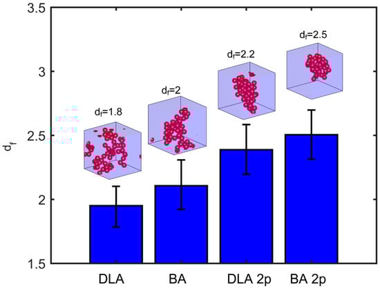 For the representation of the aggregates, the well-known DLA [29] and the BA method [30] were used here, as well as modifications of these models, to represent denser aggregates. The DLA model describes the appropriate phenomena for the formation of fractal structures [29]. An important parameter of this method is the mean free path of the Brownian diffusion of particles [30]. If the mean free path is smaller than the size of the aggregate, the morphological characteristics of the clusters are the same and the fractal dimension is approximately . In the extreme case that the mean free path remains always larger than the aggregate size, the BA model is defined. The resulting aggregates are denser than those of the DLA model [30,31]. In these cases, every particle was assumed to cease its motion as soon as it gets in contact with another one. Extension of these models allows the particle to move along the surface of the cluster in order to find a suitable second contact point (DLA 2p, BA 2p) [30]. This method results in more compact aggregates. In Figure 4, the mean fractal dimension of 50 particles forming a single aggregate is presented along with its standard derivation for the DLA, BA, and their 2p counterpart aggregation methods. A visualization of aggregates resulting from each method is also shown accordingly.