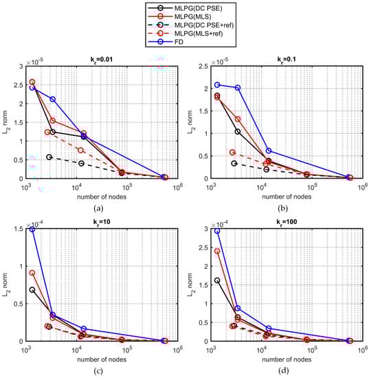 The solution was attempted using normal grids, with relatively low uniform resolution (), up to a relatively high one (), with convergence at 10−6 precision globally. For cases with local refinement, grids of 11, 21, 41, and 81 nodes per dimension are used as initial density, with double resolution near the interfaces All the methods converge practically onto the analytical solution, as the maximum errors are of the order of . For all cases, the MLPG method with local refinement converged at the same level of accuracy using one order of magnitude less nodes compared to FD ( respectively, Figure 5d). This reduced substantially the computational cost. Moreover, the FD method showed higher errors in most cases.