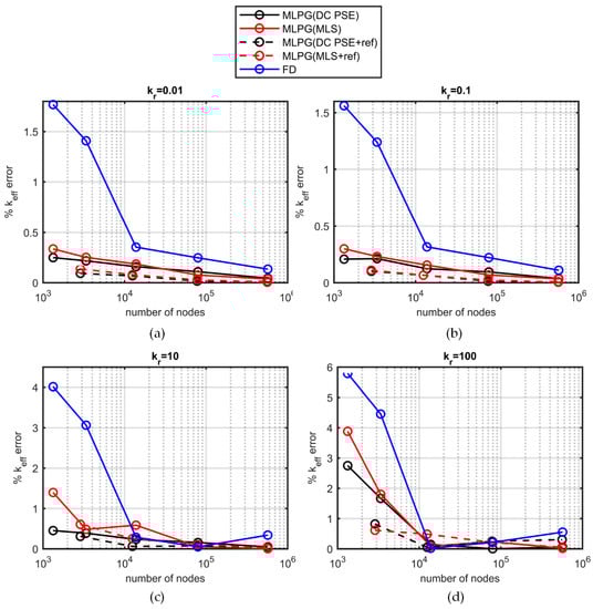 Percentage error on the effective thermal conductivity as a function of the total number of nodes for 4 conductivity ratios () (a) 1/100 (b) 1/10, (c) 10, (d) 100. Red lines: MLPG with MLS. Black lines: MLPG with DC PSE. Continuous lines: normal grids. Dashed lines: grids locally refined. Blue lines: FD. Abbreviations; MLPG: meshless local Petrov-Galerkin, MLS: moving least squares, DC PSE: discretization-corrected particle strength exchange, ref: local refinement, FD: finite differences.