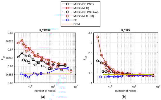 Effective thermal conductivity as a function of the total number of nodes for two different conductivity ratios () (a) 1/100 (b) 100. Red lines: MLPG with MLS. Black lines: MLPG with DC PSE. Continuous lines: normal grids. Dashed lines: grids locally refined. Blue lines: FE. Abbreviations; MLPG: meshless local Petrov-Galerkin, MLS: moving least squares, DC PSE: discretization-corrected particle strength exchange, ref: local refinement, FE: finite element, DEM: differential effective medium approximation.