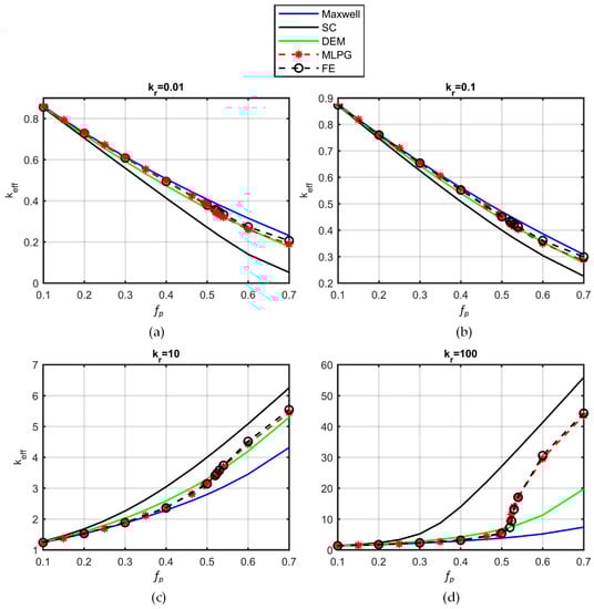 The thermal conductivity results for a single arrangement of spheres, Figure 8, are shown in Figure 9 for varying volume fraction of the inclusions. The MLPG method refers to the MLPG using the DC PSE operators and fourfold refinement near the interfaces. A grid with maximum resolution of 200 nodes per dimension proved sufficient for all cases. The problem was solved for a wide range of conductivity ratios. The simulations were in good agreement with the DEM approximation for low conductivity ratios, Figure 9a–c. In contrast, when the inclusions have much higher conductivity than the matrix (), Figure 9d, a steep increase of the effective conductivity in the region where was observed. At this volume fraction, a highly conductive path was created. This effect also appears in Figure 9c to a lower extent. This increase was not predicted by any of the EMT analytical models.