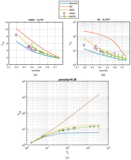 Figure 10c presents the effective thermal conductivity as a function of the conductivity ratio (). The experimental data were obtained from the same reference work [32], with behavior similar to the results with varying porosity. That is, the MLPG with the DC PSE method with local refinement near the interfaces produces results in excellent agreement with the experiments. DEM is also closer to the experimental data and the simulations than the rest of the analytical approaches studied here.