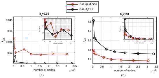 Effective thermal conductivity as a function of the total number of nodes for two different aggregates. Red lines: . Black lines: . (a) . (b) . Insets: the percentage error. Abbreviation; DLA: diffusion limited aggregation.
