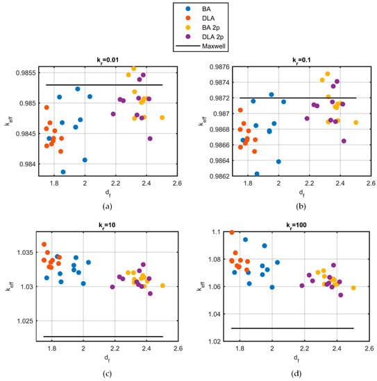 Effective thermal conductivity as a function of the fractal dimension for four different conductivity ratio values, (a) 1/100, (b) 1/10, (c) 10, (d) 100. Blue dots: BA. Red dots: DLA. Yellow dots: BA 2p. Purple dots: DLA 2p. Black lines: Maxwell model. Abbreviations; BA: ballistic aggregation, DLA: diffusion limited aggregation.