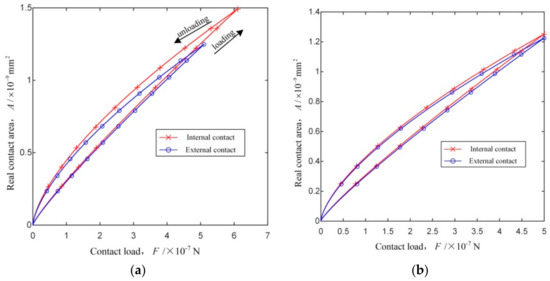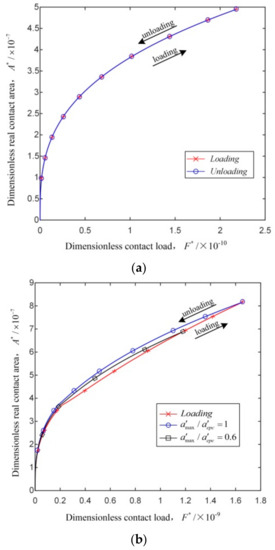 - The dimensionless real contact area of the loading–unloading process increases with the dimensionless contact load. In the elastic stage, the unloading process is the same with the loading one. In the elastoplastic stage, the dimensionless real contact area of the unloading process is greater than that of the loading process for a given dimensionless contact load; the dimensionless real contact area of the unloading process, as well as the differences of the dimensionless real contact area between the loading and unloading processes, increase with the loading interference.