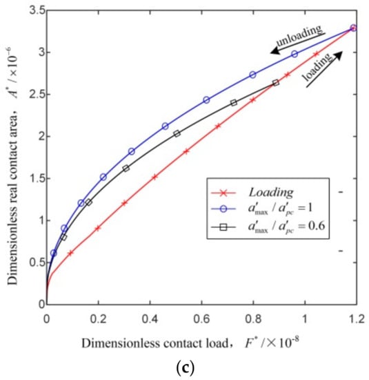 Figure 2b,c show the load–unload cycle in the first and second elastoplastic stage with the unloading points are 1.0 and 0.6 times of critical contact area. In the elastoplastic stage, the dimensionless real contact area in the unloading process is higher than that in the loading process with the same dimensionless contact load; the dimensionless real contact area of the unloading process, as well as the differences between the loading and unloading processes, increases with the loading interference. The reason is that asperities are in the elastoplastic deformation cannot fully recover in the unloading process and their curvature radius increases resulting in the adding of the contact area; the interference and quantity of asperities increase with the loading interference, leading to the further increase of the unrecoverable contact area.