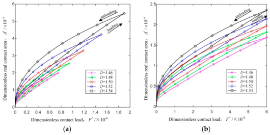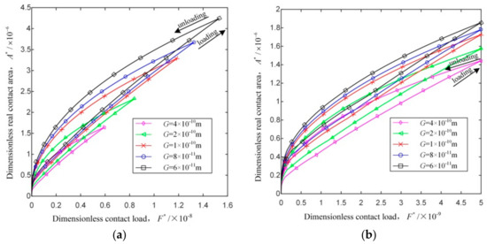 The dimensionless critical real contact area and the dimensionless critical contact load increase with decrease of G or increase of D; for a given dimensionless contact load, the dimensionless real contact area, as well as the differences of the dimensionless real contact area between the loading and unloading processes, are positively related to D, and negatively correlated with G. The reason is that the roughness of surface decreases as G decreases [46], as well as D increases [29,47]. So it can be inferred that in the load–unload cycle in the elastoplastic stage, as the roughness of surface decreases, although the overall interference of asperities decreases, the quantity of asperities deformed increase rapidly which has a greater influence leading to the phenomenon shown in Figure 3 and Figure 4.