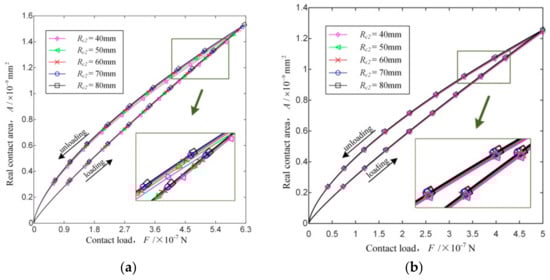 According to Equation (52), it is obvious that A0 increase with Rc2 when Rc1 is constant, and A0 of internal contact is greater than that of external contact. From Figure a,b of each figure, it can be found that Rc2 and contact type have little effect on the real contact area. Because the real contact area between two surfaces is much smaller than the nominal contact area, so A0 has a greater influence on the tendency of the dimensionless contact area and load. Therefore, the conclusion from Figure c,d of each figure is believable.