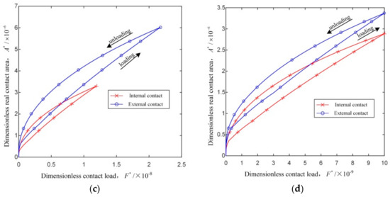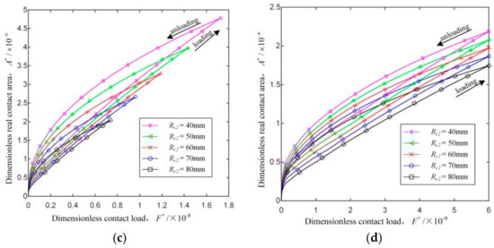 For a load–unload cycle of two cylindrical surfaces, the effects of the curvature radius and the contact type on the dimensionless load-area relation are contrary to those on the dimensional load-area relation. The reason is that both A and A0 are influenced by Rc2 and the contact type. The contact load and the contact area are proportional to in contact theory. According to Equation (48), it is obvious that increase with Rc2 when Rc1 is constant, and of internal contact is greater than that of external contact. Therefore, the conclusion from Figure a,b of each figure is convincible.