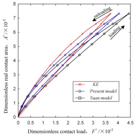 Figure 7 shows the comparison of the present model, KE model and Yuan model on load-area relation. The calculation results of the present model, KE model and Yuan model have the same trend which shows the feasibility of the model. In loading process, the dimensionless real contact area of present model is greater than that of KE model with F* ≤ 1.786. In the unloading process, the dimensionless real contact area of present model is greater than that of KE model with F* ≤ 0.487. Further, compared with the Yuan model, the present model is closer to KE model with the same fractal parameters.