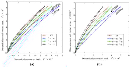 For further analyzing the correlation between the present model and KE model, the relation between the dimensionless contact area and dimensionless contact load is plotted in Figure 8 with G = 10−10 m and 1.4 ≤ D ≤ 1.5 in Figure 8a, D = 1.45 and 10−11 m ≤ G ≤ 10−9 m in Figure 8b. The trend of the dimensionless contact area in loading and unloading process with different fractal parameters agrees with the KE model. The results of the two models are difficult to perfectly coincide with each other, as shown in Figure 8, as the statistical model adopts the Gauss distribution function of asperities height, and the fractal model adopts the size distribution function of asperities. Further, the fractal dimension D and the profile scaling parameter G are not involved in the statistical model, the coincidence of calculation results is affected to some extent. In conclusion, the calculation result of the present model has the same trend with the statistical result. When D = 1.45, G = 10−10 m, the calculation result in the model proposed is close to that of KE model, which shows the validity of the model.