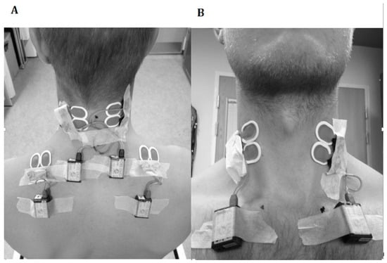 Bilateral electrode placement above the upper trapezius muscle (mUTR) and upper neck extensors muscles (mUNE) (A) and sternocleidomastoideus muscles (mSCM) (B).
