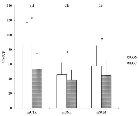 The muscle activity (%MVE) of the upper trapezius muscle (mUTR), upper neck extensors muscles (mUNE), and sternocleidomastoideus muscles (mSCM) in the concentric phase (CON) and eccentric phase (ECC) during shugs (SH), cervical extension (CE), and cervical flexion (CF), respectively. * Indicates significant difference between CON and ECC within exercise.