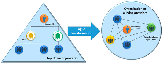 The so-called “traditional” organizations are typically hierarchical, and static, where goals and decisions flow through the hierarchy, with leadership at the top of that hierarchy. These organizations work using linear planning and control. The “skeleton” structure of the traditional organization is strong, but often rigid and slow. On the other hand, an agile organization is a network of teams with a people-centered culture. This type of organization is characterized by the existence of rapid cycles of learning and decision, enabled by technologies, guided by a strong common purpose to co-create value for all the stakeholders. The agile organization has the ability to quickly adapt to new challenges, i.e., it has a competitive advantage that translates into creating value in a stable way. An agile organization is both stable and dynamic [22,23]. Thus agile organizations, unlike traditional organizations, mobilize quickly. By analogy, and according to Aghina et al. [22], an “agile organization is a living organism” (Figure 1).
