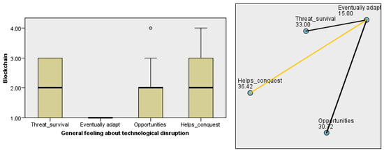 Moreover, observing Figure 3, we can also conclude that all the respondents who expressed as a general feeling of the organization “Eventually the organization will adapt” as an option, present as to the degree of preparation of the category “Blockchain”, distribution significantly different from the others that affirmed there is another feeling. It should also be noted that in this option all organizations are unprepared. We also found, as revealed in Figure 4, that the options in question A4 that most influenced the evaluation of the respondents regarding the degree of preparation of the “Blockchain” are “Eventually the organization will adapt” and “Helps in the conquest of new markets” (boxplot and yellow line).