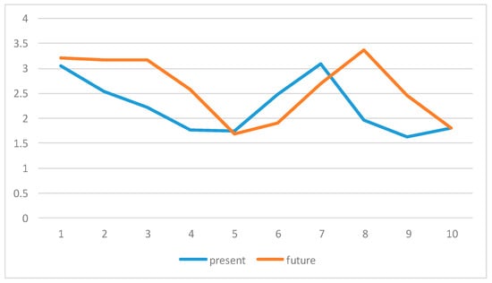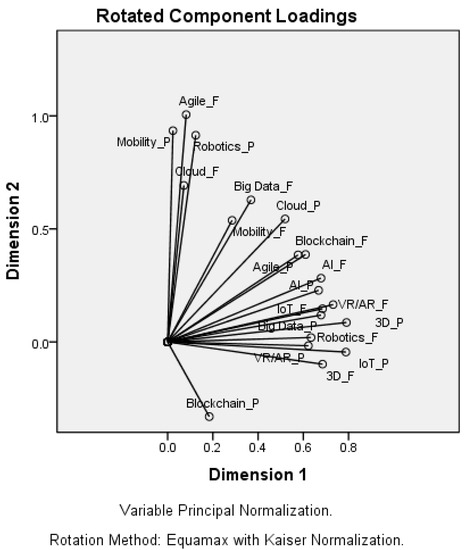 Finally, with the objective of evaluating and comparing the current state of digital adoption in respect of the preparation of these in relation to the prevailing technological categories, with the future priorities of the organizations in the implementation of DT in Portuguese organizations we started by comparing the importance of technological categories, both in Present and in the Future (Questions B8 and C2). For this purpose, we applied the CATPCA with Equamax rotation (Table 6 and Figure 5) and also the graphical representation of the average degrees assigned to each of the technological categories, in the present and the future (Figure 6), as this was the descriptive measure which was more discriminating in the comparison of categories. Table 6 and Figure 5 show that the technological categories most closely related to Dimension 1 are: