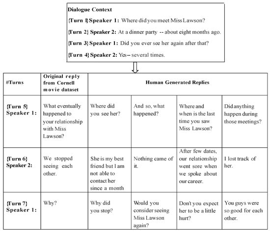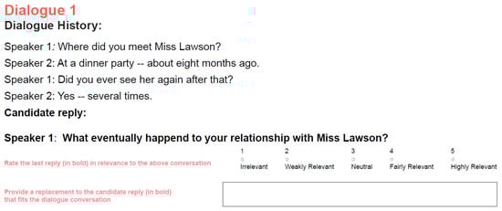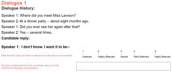We developed a website for data collection and used the crowdsourcing platform Amazon Mechanical Turk (AMT) (Full anonymity of the users were maintained and no ethical concerns were raised by the host institution) for collecting human annotations on selected Cornell movie dialogues. The dataset creation is performed in the following steps: First, we used simple random sampling to select 4750 dialogue contexts from the Cornell movie dataset in which each dialogue is divided into utterances. Since the dataset contains human–human dialogues, we assigned each utterance alternatively as Speaker 1 and Speaker 2 as shown in Figure 1. The dataset consists of multi-turn dialogues ranging from two to the maximum of seven turns. Then, each dialogue history is appended with an actual reply from the movie dialogue dataset and also with a candidate negative reply which is sampled uniformly from a possible set of replies, thus making the dataset size of 9500. At the beginning, basic demographics of the users were asked including Age range, Gender, and English proficiency level. These demographic variables are collected so that the dataset can be tailored as per the needs and preferences of researchers to develop conversational agents for different demographics. In the next step, each AMT user was given a task of 20 sampled dialogue conversations and was asked to rate the last reply of the dialogue conversation from 1–5, (where 1: Irrelevant reply; 2: Weakly relevant reply; 3: Neutral; 4: Fairly relevant reply; 5: Highly relevant reply) according to the dialog context and provide their relevant reply in replacement to the last reply. The total number of completed tasks were 1425.