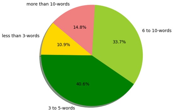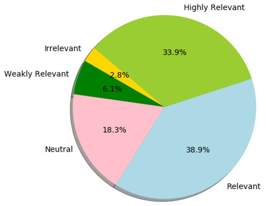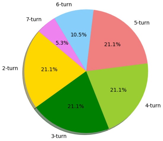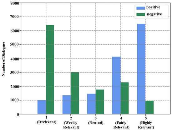 The number of turns per dialogue used in the dataset is given in Figure 6. Figure 7 shows the distribution of the number of words among all the obtained dialogue replies from the users. Figure 8 presents the evaluation of human generated replies on a selected HUMOD dataset. As can be seen from the figure, 2.8% of the AMT users rated Irrelevant, whereas, in the original dataset, the Irrelevant score was around 3.3% for the same dialogue–reply pairs. Figure 9 presents the histogram of user ratings for positive and negative replies. As can be seen from the figure, positive replies are rated high (4 or 5) by users, about 74% (10,610 out of 14,250) and negative replies are rated low (1 or 2), around 73% (10,404 out of 14,250). It is crucial to take into account the number of low scores in positive replies and high scores in negative replies which introduce noise in the dataset. Thus, it is important to get human judgments even for positive pairs. The negative training data can be even harmful for binary text classification [30], which may occur in the case of next utterance classification in dialogue settings. Therefore, another approach for training dialogue managers could be Positive-Unlabeled (PU) Learning [31]. In PU Learning, there is a positive set, and instead of negative there is an unlabeled dataset which can contain positive and negative samples. Existing methods [31,32] which perform well in PU Learning problems can also be applied to next utterance classification for dialogues.