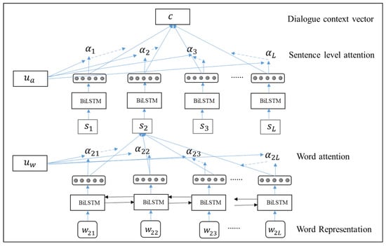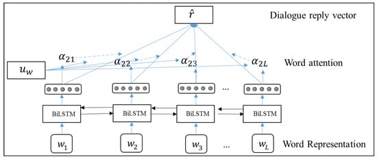 In this work, we implemented two separate networks, one for dialogue context and another for the dialogue reply. Context encoder is a Hierarchical Attention Network (HAN) [11] as shown in Figure 10. It encodes dialogue context to a dialog context vector c. Reply encoder network is a biLSTM [34] network with attention mechanism on top to convert reply to a reply vector (Figure 11).
