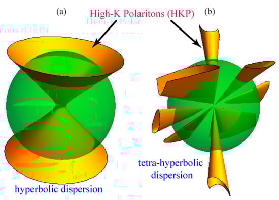 Hyperbolic topologies have sparked the imaginations of science fiction prosaists for almost a century []. In turn, the topology of isofrequency k-surfaces in photonic materials now fascinates the members of the optics community. The known topologies include bounded k-surfaces, such as spheres or ellipsoids, and unbounded k-surfaces—single- and double-leaf hyperboloids [,,], and recently discovered bihyperboloids []. As can be seen from this list of k-surface topologies, the main difference between them and therefore the key to their classification is the propagation or absence of high-k modes in the corresponding materials (Figure 1). The high-k modes, which are the short-wavelength solutions of macroscopic Maxwell’s equations in hyperbolic metamaterials, are of primary interest in photonics, and have already found applications for optical imaging in nanoscopic resolution using hyperlenses, emission control due to diverging optical density of high-k states, and emission-directivity control [].