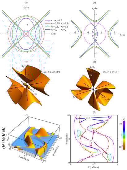 As was demonstrated in Ref. [], the coefficients follow from the solution of Maxwell’s equation. The topological asymptotic skeleton of the isofrequency surfaces (Equation (1)) can be found in the high-k limit . The high-k states are those tending to the conical k-surfaces given by