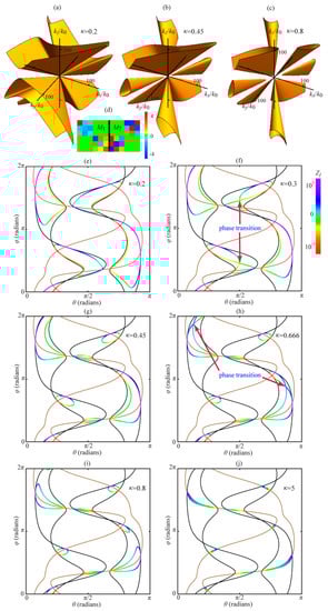 The HKP states for the noted in panels (e)–(j) are color-coded in accordance with their as indicated to the right of Figure 3f. The HKP for nonzero are positioned in the regions between the lines, in accordance with Equations (14) and (18), and touch these lines at the intersections of and . The HKP states group into several disconnected curves, the number of which characterizes the topology of the phase. Note that each curve is split into two parts by the curves at their intersections with . The resulting two subcurves of HKP states correspond to two different branches of Equation (18).