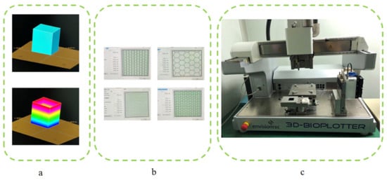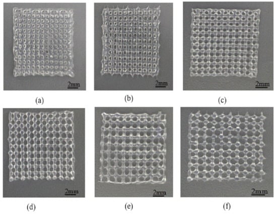 - Suppression bubbles of printing materials—the continuity of the extrusion line is very important for the accuracy and forming effects of the scaffold [22]. In the preparation of SA-GEL composite material, bubbles will be introduced due to mixing and other factors. The bubbles in the material will affect the continuity of extrusion, and the break point will affect the mechanical properties of scaffolds. Accordingly, bubbles in the barrel solution should be cleaned. In this paper, a static suppression method was used to solve the problem—the cylinder filled with composite solution was heated upside down until the bubbles in the material could not be observed by naked eyes.