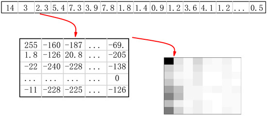 In this study, a 2-D CNN model is selected to achieve the fault diagnosis. However, the wavelet packet coefficient is not appropriate as the input of CNN model. In order to obtain the appropriate input, a data-to-image method is designed to form the two-dimension input data for CNN model. As shown in Figure 1, it consists of two steps. Firstly, the wavelet packet coefficient, which is obtained from the raw signal by using WPT, is reshaped into a 2-D matrix with a size of where and could be selected manually according to the length of wavelet packet coefficients. Then, the matrix elements are normalized to −255 to 255. Secondly, each element of obtained matrix is converted to a pixel, and a gray image with a size of is obtained. In this study, the pooling window is commonly applied, and the length and width of feature map in each pooling layer is reduced by same, so it is recommended to get the gray image with a size of .