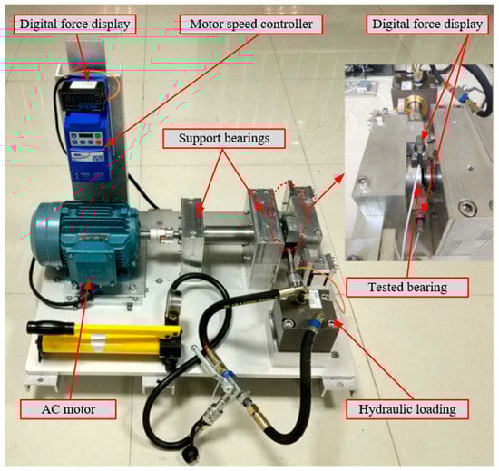 The rolling bearing dataset generated by the Institute of Design Science and Basic Components at Xi’an Jiaotong University (XJTU) [27], is analyzed. The experimental setup is shown in Figure 2. The bearing testbed consists of an alternating current (AC) induction motor, a motor speed controller, a support shaft, two support bearings (heavy duty roller bearings), a hydraulic loading system, and so on. Fifteen rolling bearings of the type LDK UER204 were carried out in different degradation tests under three operating conditions. There exist five types of fault conditions with these tested bearings, which are inner race fault, outer race fault, cage fault, and two mixed faults. In order to collect the degradation signals, two PCB 352C33 accelerometers are placed on the horizontal and vertical directions of housing of the bearings, and signals are collected at a sampling frequency of 25.6 kHz. A total of 32768 run-to-failure sampling points are recorded every minute.