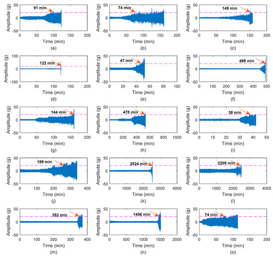 In each run-to-failure testing experiment, the accelerated deterioration test of the bearing was close to stop when the amplitude of the vibration signal was higher than 20 g. Based on this, the subsequent degradation vibration signals are selected as the complete fault signals when the acceleration exceeds 20 g for the first time. Figure 3 shows the result of complete fault signal selection of fifteen degradation tests. In this study, due to the load acts on horizontal direction, the horizontal monitored signals of the tested bearings are selected to evaluate the performance of the proposed method.
