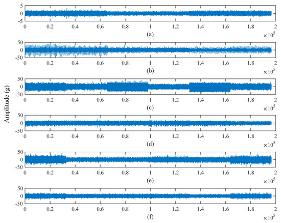 The types of bearing condition are only considered in this study, and the impact of different operating conditions was ignored. Therefore, the datasets of the different operating conditions of bearings with the same condition went into one dataset. Figure 4 shows the vibration signals of the six types of condition signals.