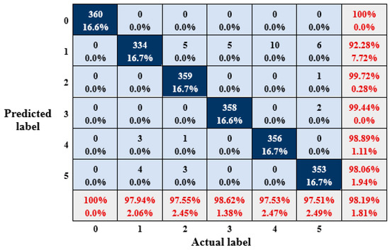 There are in total 7200 bearing condition samples. As discussed in Section 3.1, all samples are converted into 1-D time-frequency coefficient vectors of size 64 by using the wavelet packet transform. To form the input of CNN model, the data-to image conversion method is used to convert these coefficient vectors into the gray images with a size of 8 × 8. Six types of Gray scale images from six conditions are shown in Figure 5. The main parameters of designed CNN model are presented in Table 2, which includes three trainable convolutional (Conv) layers and two max-pooling layers with two fully connected layers. The performance of the proposed CNN-based fault diagnosis model is evaluated by using ten trials. For each time trial, the training samples, validation samples, and testing samples are randomly selected. Figure 6 shows the confusion matrix of one trial result. Table 3 presents the diagnosis performance of the proposed method in ten trials. From the results, the proposed model presents an excellent diagnostic accuracy of 100% for normal bearing condition, and other fault types exceed 93%.