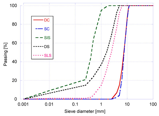 Standardized siliceous sand, CEM I 52.5 R and cupola slag have been used for the manufacture of conventional mortars. For the manufacture of the different concrete proportions, coarse 6/12 (DC) diabase and coarse 6/12 (SC) slag have been used, limiting their quantities to avoid problems of blockage and segregation. Diabase sand 0/6 (DS), electric arc furnace slag 0/6 (SLS), and silica sand 0/2 (SIS) have been used as fine aggregates. The SCM used include limestone filler (LF), fly ash (FA), and cupola slag filler (CS). The granulometric distribution of the aggregates used (coarse and fine) according to EN 933-1 is shown in Figure 1.