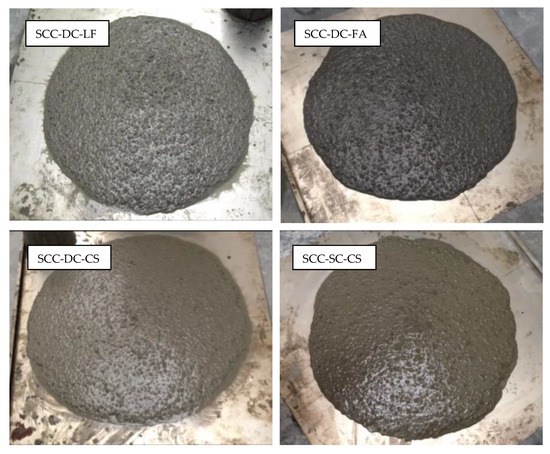 The flowability is at odds with viscosity, incorporating high-density aggregates requires a viscous paste (high fine content and low w/c ratio) that prevents the segregation of aggregates. Increasing viscosity also means obtaining a higher volume of occluded air or a poorer surface finish, which is why it is important to establish a compromise between both variables. In Figure 2, the correct distribution of aggregates in all mixes can be observed. In the case of SCC-DC-LF, areas with higher aggregate concentration and a mortar band of about 10 mm thick and slight bleeding are observed on the perimeter of the disk. The behavior of the SCC-DC-FA is more stable, favored by the shape of the fly ash particles that provide greater homogeneity in slump. Although it also has a mortar band about 10 mm thick, no bleeding is reported. In the case of SCC-DC-CS there is a homogeneous distribution of aggregates but a decrease in the viscosity of the paste and consequently greater bleeding and exudation due to incorporating the vitreous powder. The disk of the SCC-SC-CS shows a very homogeneous, symmetrical, and stable distribution. There is no segregation or concentration of coarse aggregates despite the high density of slags although there is a mortar band of about 10 mm around the disk.